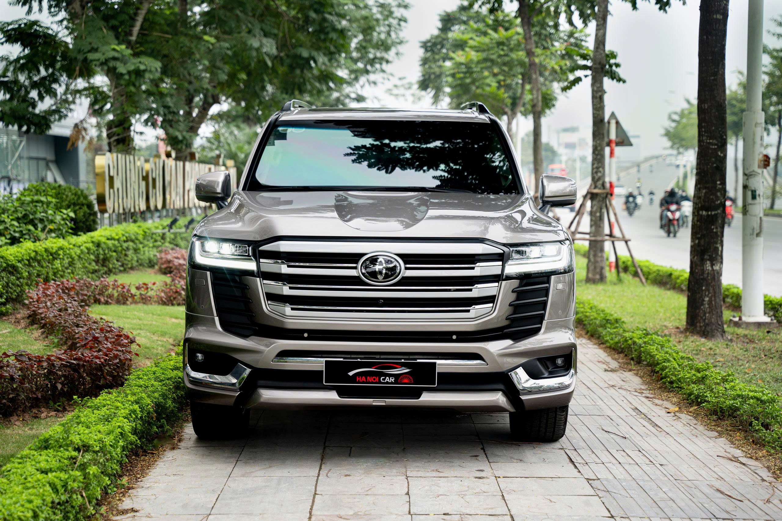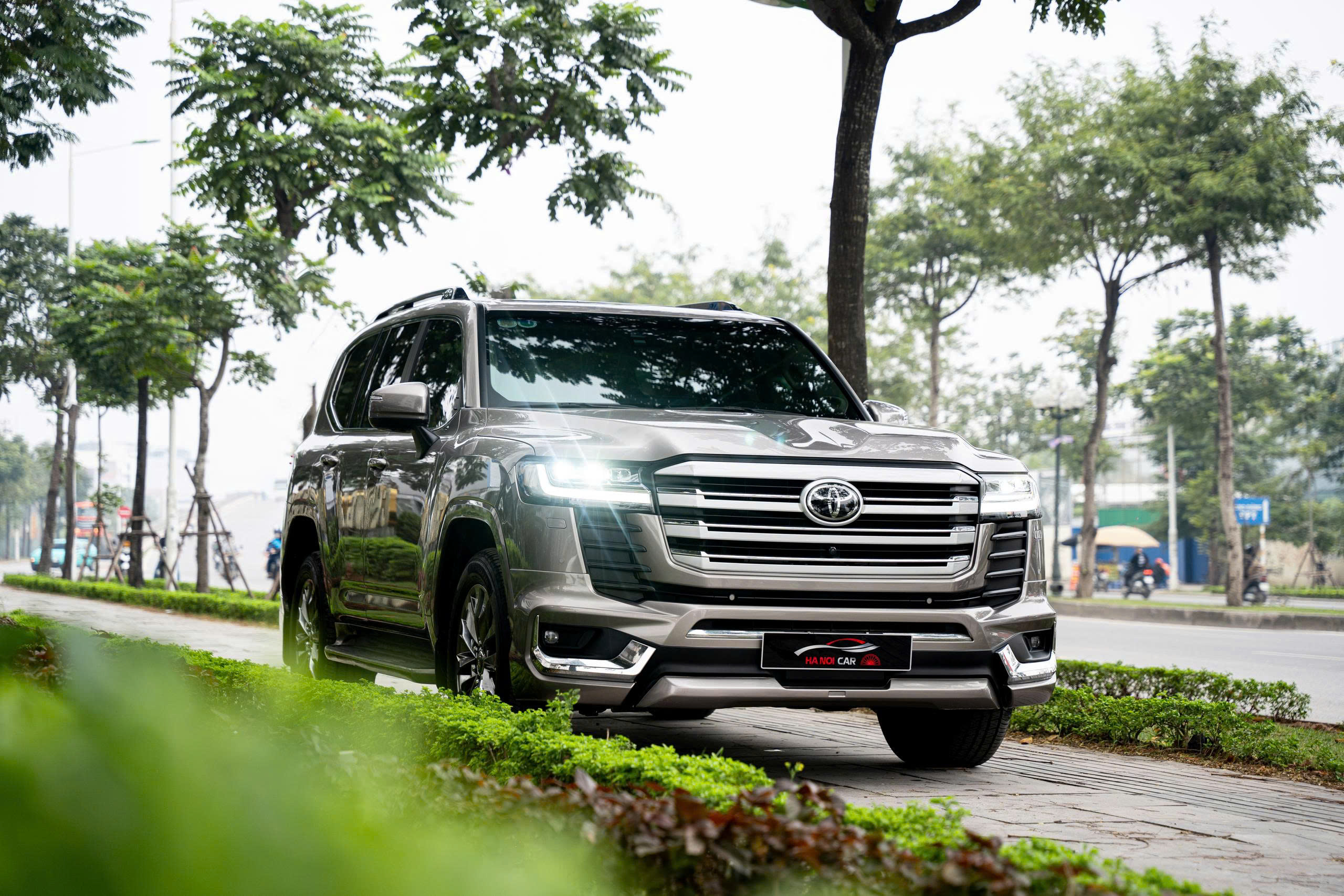 LC300 nguyên bản vốn nổi tiếng với diện mạo bề thế, hầm hố và có phần thực dụng đặc trưng của dòng SUV địa hình nhà Toyota. Tổng thể xe dài 4.985 mm, rộng 1.980 mm và cao 1.945 mm, mang đến sự cân đối và chắc chắn. Thiết kế đầu xe với lưới tản nhiệt cỡ lớn gồm các nan ngang mạ chrome tạo cảm giác cơ bắp, trong khi cụm đèn LED sắc cạnh giữ lại nét hiện đại. Đây là phong cách đặc trưng giúp Land Cruiser LC300 giữ được tính nhận diện mạnh mẽ và thu hút những khách hàng yêu thích sự bền bỉ, đơn giản và không quá phô trương.